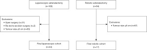 A total of 61 patients underwent elective adrenalectomy for LATs (≥6 cm) (Figure 1). The laparoscopic database initially included 160 cases; after excluding open surgery (n=31), redo/re-excision (n=2), and tumours ≤6 cm (n=83), 44 patients remained. The robotic cohort included 84 cases, of which 17 met the inclusion criteria after excluding those with tumours ≤6 cm (n=67).